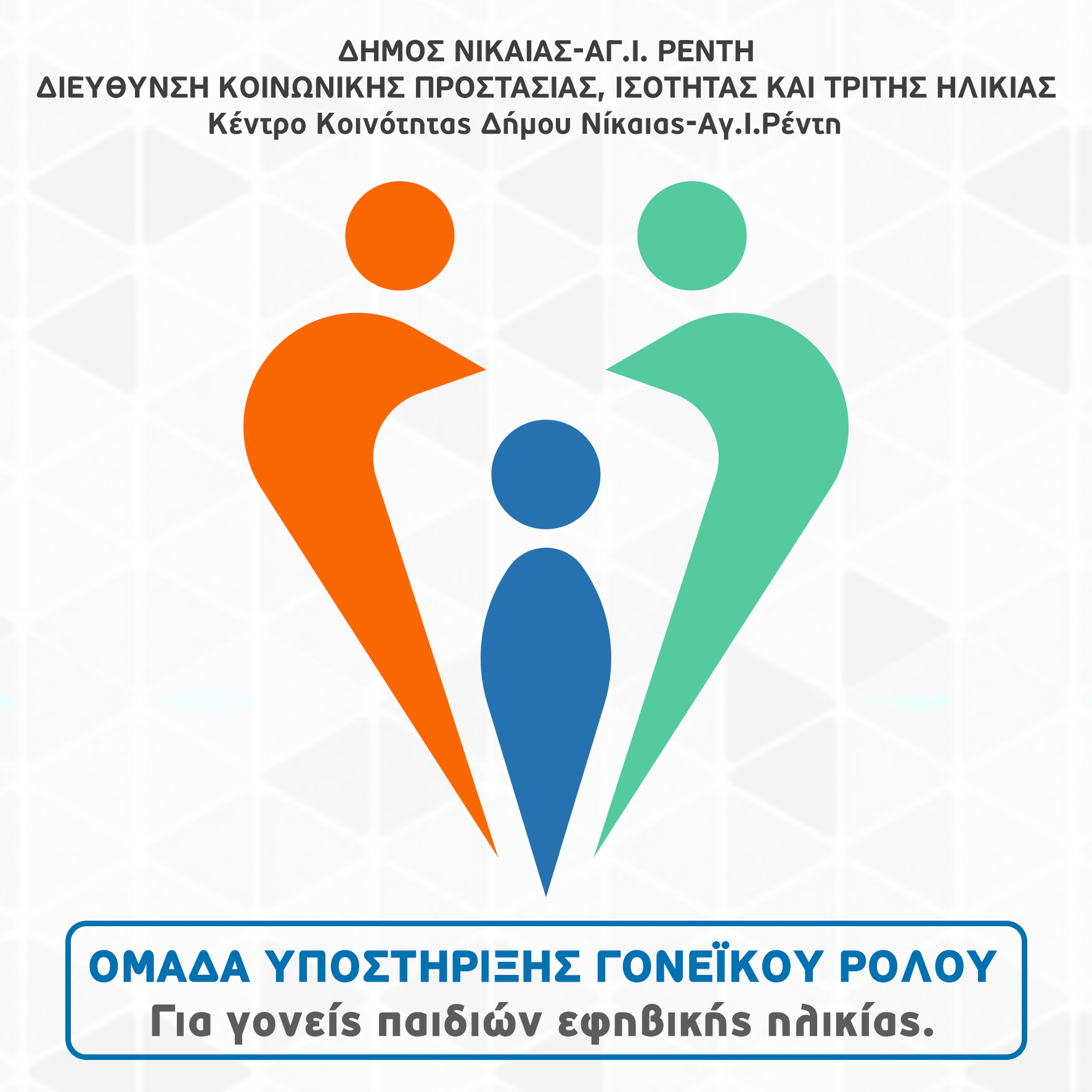 Το Κέντρο Κοινότητας Δήμου Νίκαιας Αγ. Ι. Ρέντη της Διεύθυνσης Κοινωνικής Προστασίας, Ισότητας και Τρίτης Ηλικίας, ανακοινώνει τη δημιουργία Ομάδας Υποστήριξης Γονεϊκού Ρόλου για γονείς παιδιών εφηβικής ηλικίας. Στόχος της ομάδας είναι να δοθεί χώρος στους γονείς ώστε να μοιραστούν εμπειρίες και ζητήματα που προκύπτουν στην καθημερινότητα με εφήβους και  να ανακαλύψουν νέες πρακτικές διαχείρισης δυσκολιών και να βιώσουν με ενσυνείδηση τον ρόλο τους.